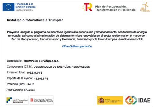 TRUMPLER ESPAÑOLA, S.A. ha recibido una ayuda para su proyecto de autoconsumo "Instalación fotovoltaica en Trumpler" cofinanciada por el Mecanismo Europeo de Recuperación y Resiliencia PRTR-Next Generation EU, coordinada por el Ministerio para la Transición Ecológica y el Reto Demográfico través de IDAE y gestionada por las autonomías según el Real Decreto 477/2021, con el objetivo de conseguir una economía más limpia y sostenible. En este proyecto se han instalado 256 módulos de 485 Wp con una potencia total de 124,16 kWp.